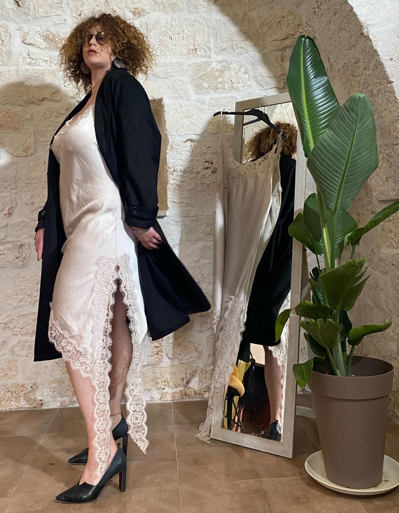 Il design regolare si adatta perfettamente alla figura curvy, offrendo una vestibilità comoda e un taglio moderno. La particolarità della linea asimmetrica, con un lato più lungo rifinito da un delicato pizzo e l’altro più corto, rende questo capo davvero unico e originale, aprendosi a molteplici possibilità di abbinamento, dal casual elegante all’eleganza raffinata per occasioni speciali.