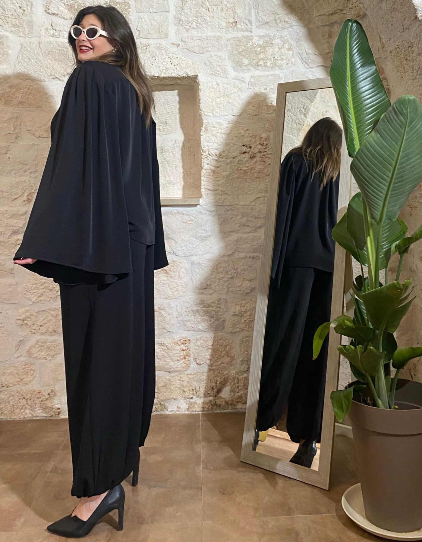 Il completo Jennifer nero di Matita Curvy è un capo versatile e moderno, pensato per valorizzare la femminilità curvy con un comfort eccezionale e uno stile contemporaneo. Realizzato interamente in poliestere, il completo è morbido al tatto e si indossa con facilità grazie a una buona elasticità che segue i movimenti del corpo senza costrizioni. Il pantalone dal taglio ampio presenta un elastico sotto che aggiunge praticità e un tocco sportivo, mentre la camicia sopra si distingue per le maniche ampie a tromba, un dettaglio fashion che dona carattere e personalità.