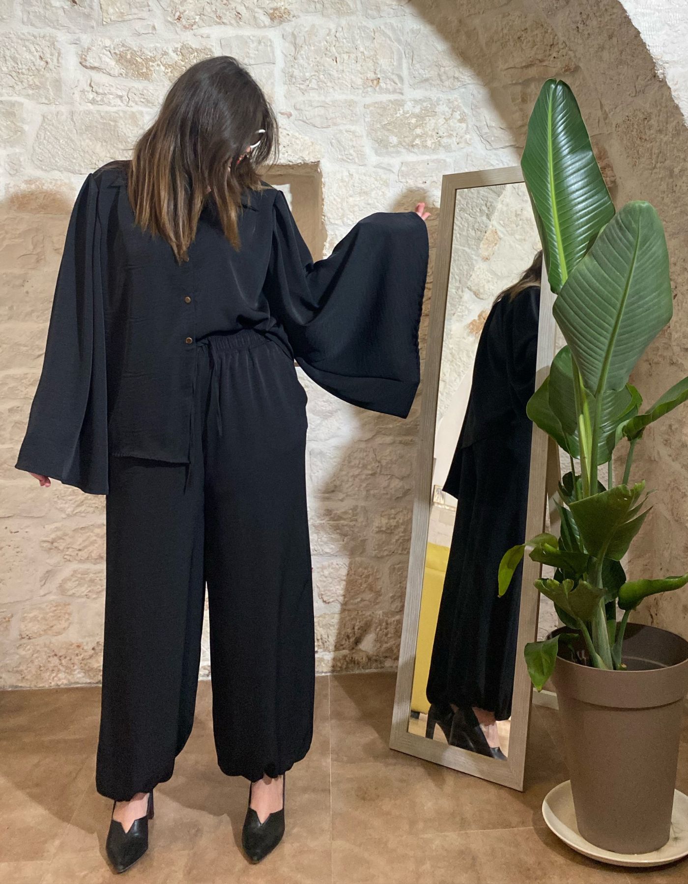 Il completo Jennifer nero di Matita Curvy è morbido, confortevole e con buona elasticità. Pantalone ampio con elastico sotto e camicia con maniche a tromba. Vestibilità over, taglia unica 50-54, perfetto per look sportivi ed eleganti.