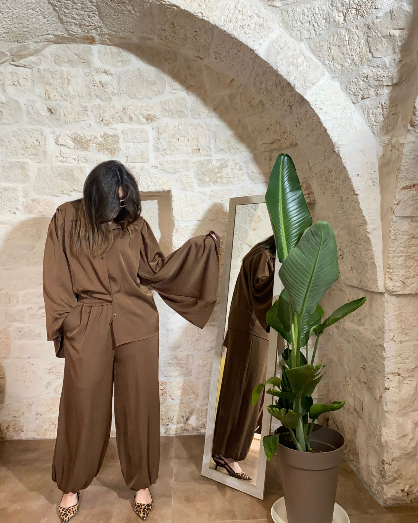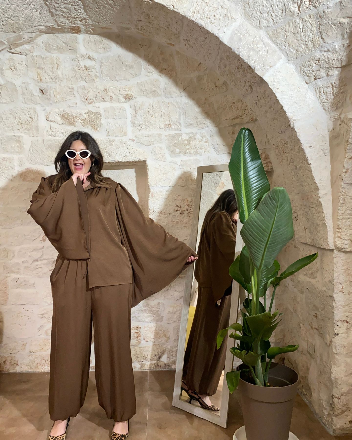 Indossare il coordinato marrone curvy significa sentirsi eleganti e sicure, valorizzando la propria femminilità con stile. Ogni dettaglio è pensato per offrire comfort e raffinatezza in ogni occasione.