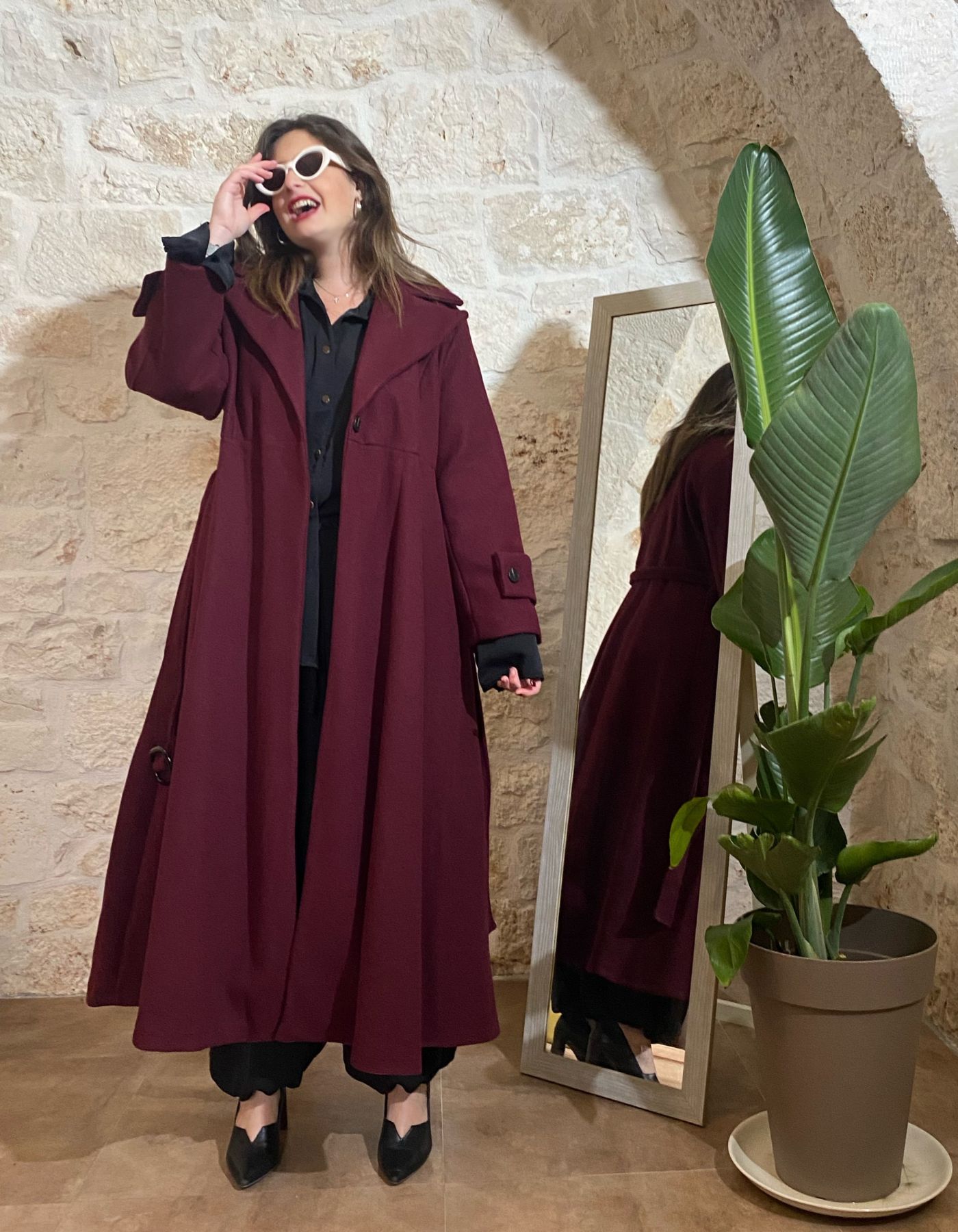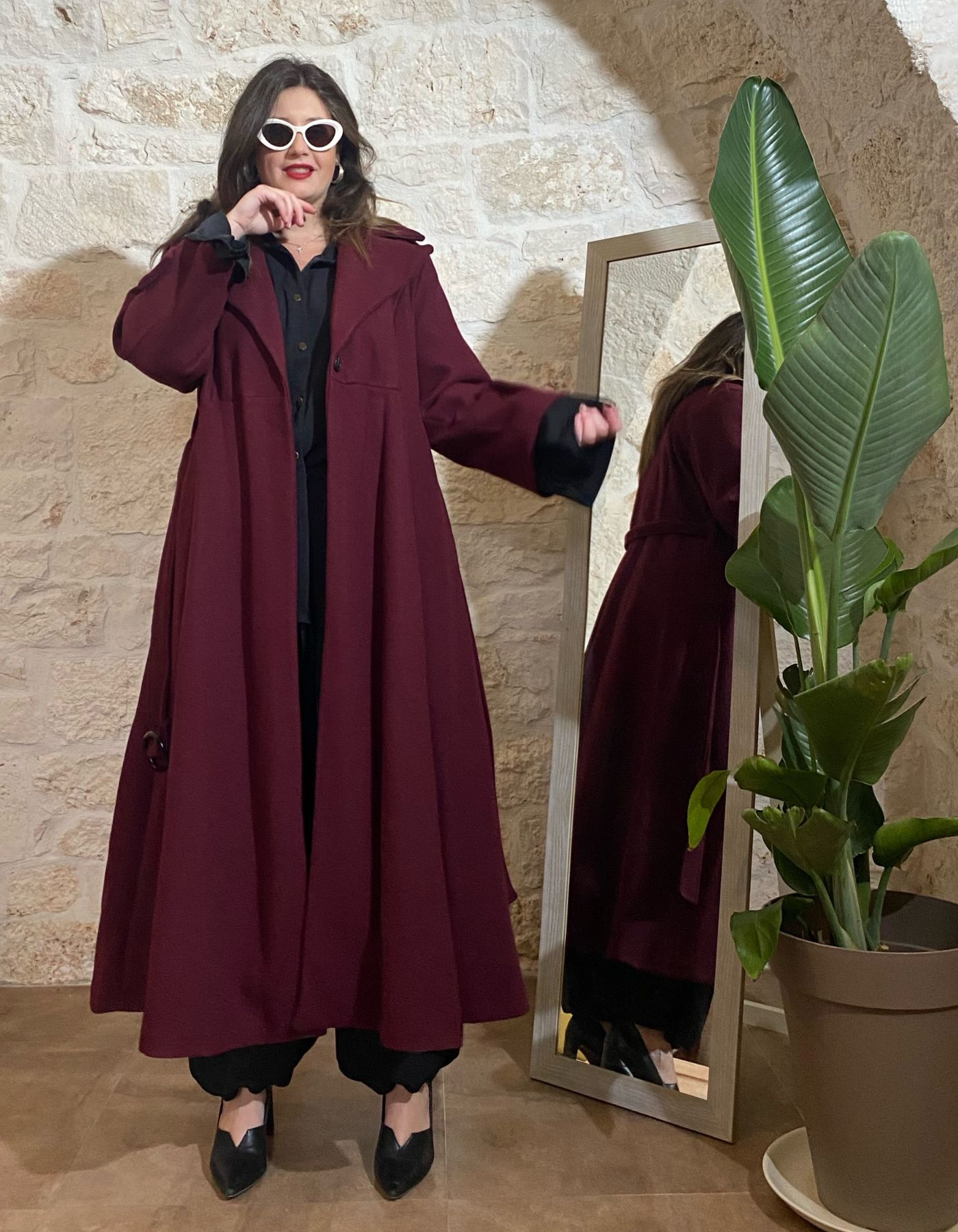 Lo stile del CAPPOTTO LADY DIANA BORDO’ è più che mai regale, ma con un tocco over che lo rende perfetto per chi ama un look audace e contemporaneo. La lunghezza arriva fino alla caviglia, avvolgendo le forme con un effetto scenico e raffinato, ideale per chi cerca un capo curvy capace di unire praticità e classe.