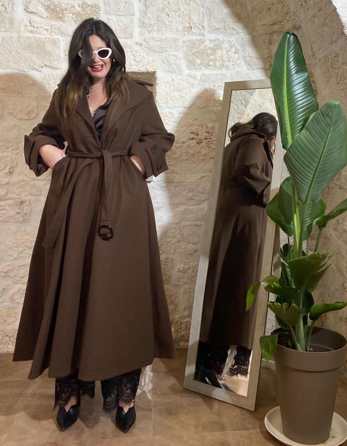 Pensato per una vestibilità curvy, questo cappotto si adatta comodamente a taglie dalla 48 alla 54, esaltando le curve senza comprimere, garantendo una silhouette armoniosa e naturale. La modella in foto indossa la taglia unica, che rappresenta perfettamente la versatilità e l’adattabilità del capo a diverse fisicità.