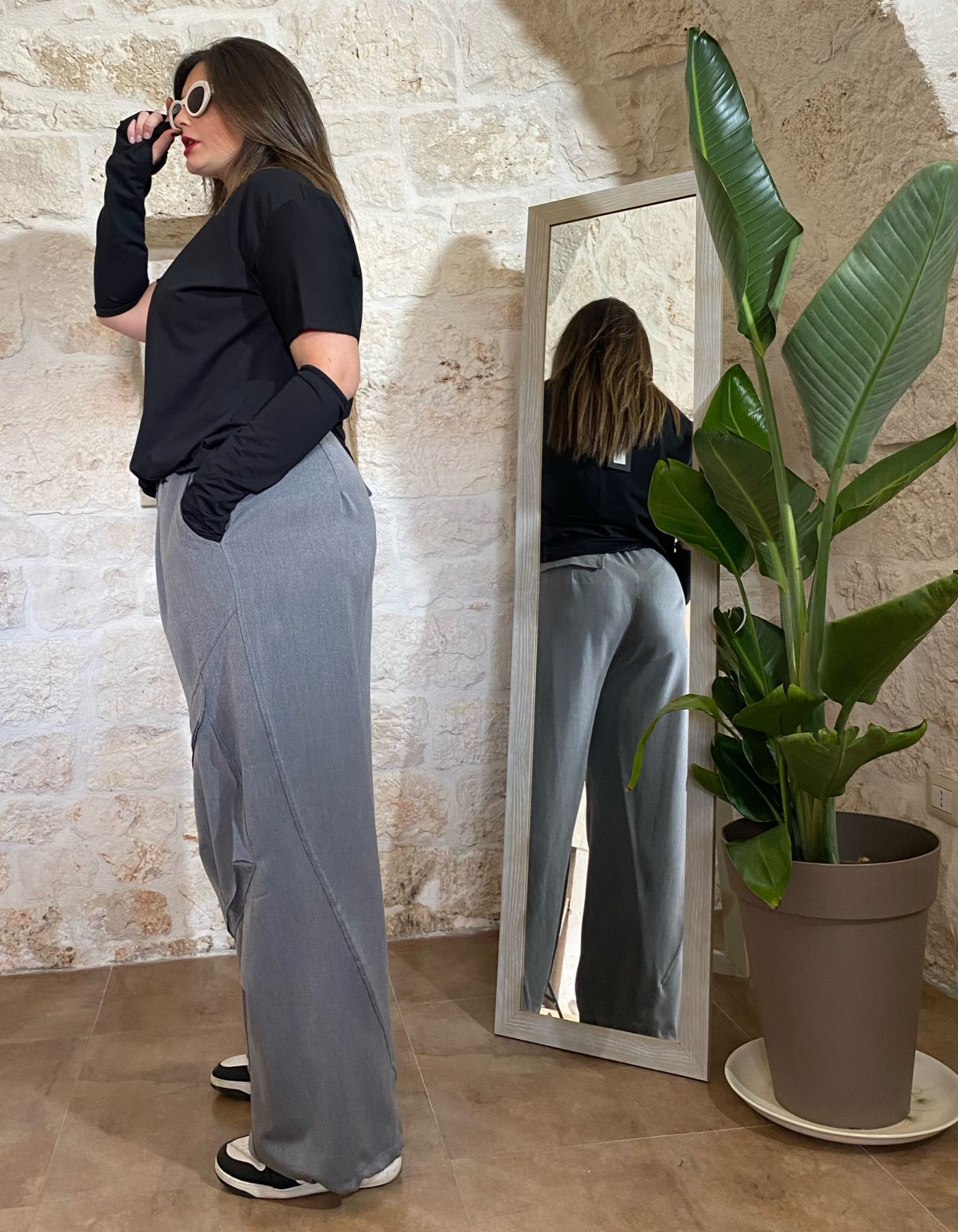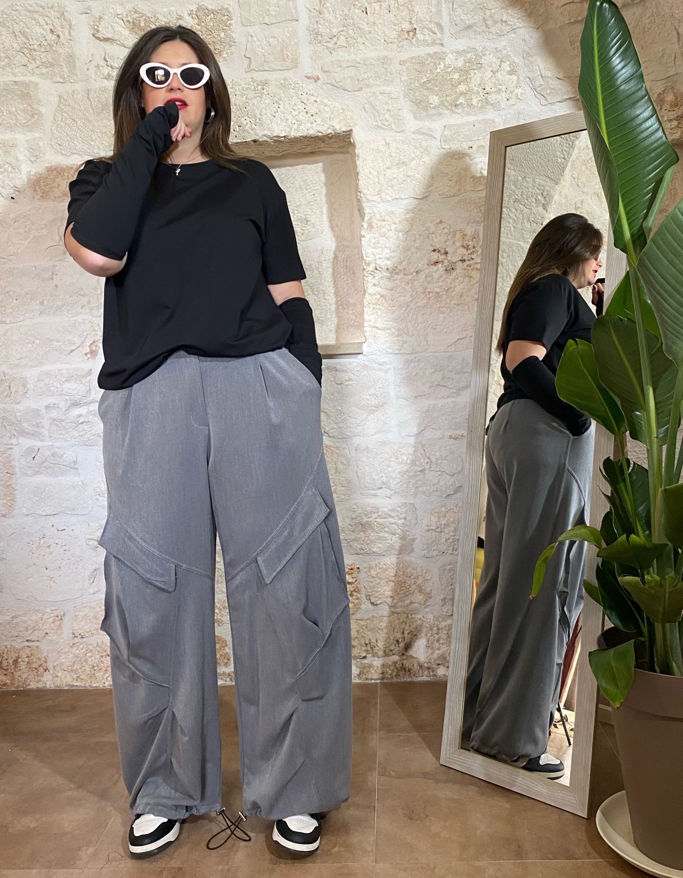 Gli elastici sul fondo completano il design rendendo il pantalone versatile e adatto a diverse calzature, dal casual allo sportivo, senza rinunciare a un tocco di originalità. Questo pantalone è ideale per chi ama outfit che combinano comodità e tendenza, sempre con un occhio di riguardo alle esigenze delle taglie curvy.