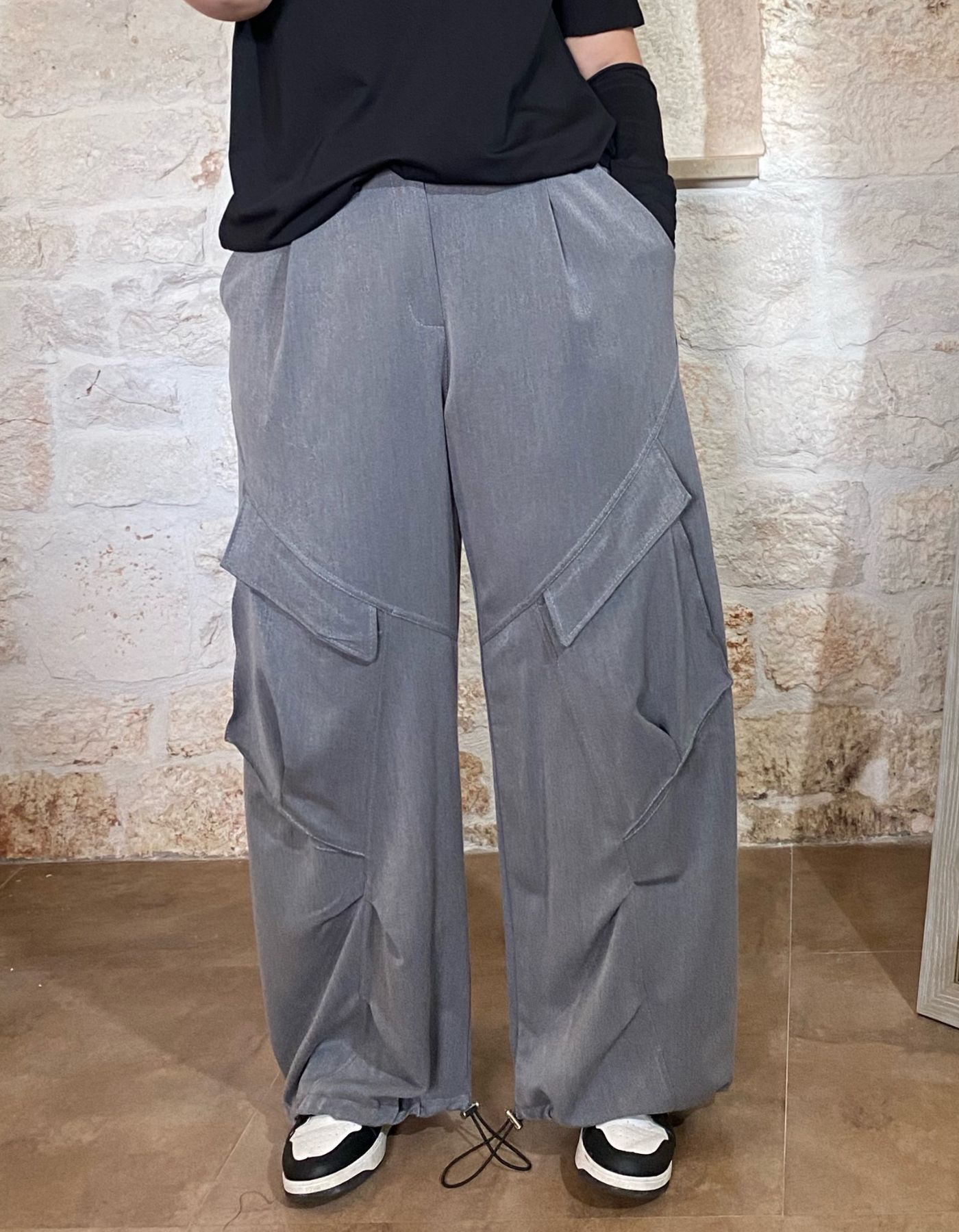 Il PANTALONE GRIGIO CON TASCONI di Matita Curvy è un pantalone oversize e caldo in poliestere, con abbottonatura e zip, elastici sul fondo e tasconi frontali. Taglia unica 48-54, stile casual e comodo per donne curvy.