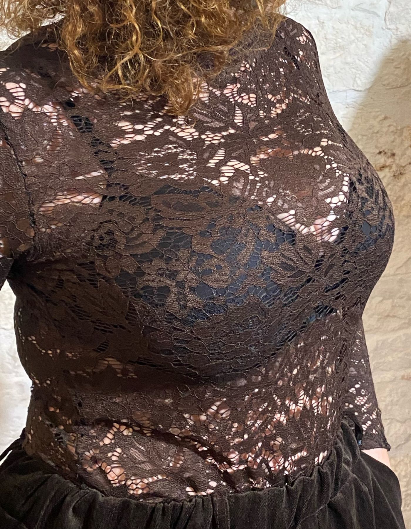 Il body in pizzo marrone di Matita Curvy è morbido, confortevole e leggermente elastico. Realizzato in cotone e poliestere con pizzo ricamato, ha una vestibilità oversize ideale per taglie 50-52, unendo stile e comfort.